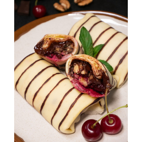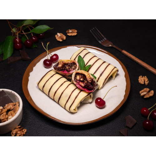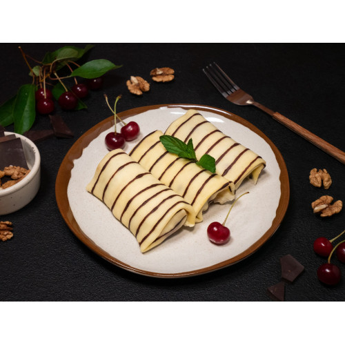 Cherry and Chocolate Crepes are delicate thin pancakes with a rich dessert-style filling. The batter is prepared on cow’s milk (34%) with premium wheat flour (11%), butter, corn flour (2%) and chicken eggs (11%), giving the crepes a soft, elastic texture and a gentle creamy taste.