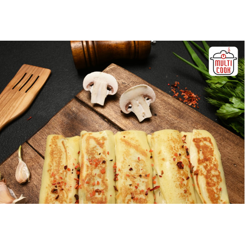 Chicken and Mushroom Crepes are thin, delicate pancakes with a hearty, savory filling – perfect for a quick hot meal or appetizer. The crepe batter is made from cow milk, premium wheat flour, chicken eggs, butter, water, sugar and salt, which gives the pancakes a soft, elastic texture and a light golden colour after frying.