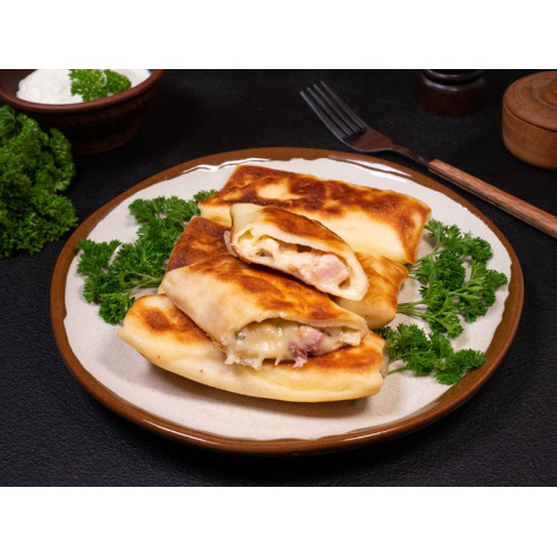 Ham and Mozzarella Cheese Crepes are thin, delicate savory pancakes with a rich, cafe-style filling. The crepe batter is made from premium wheat flour, cow milk, chicken eggs, butter, white granulated sugar and salt, so the pancakes turn out soft, elastic and lightly golden after frying.