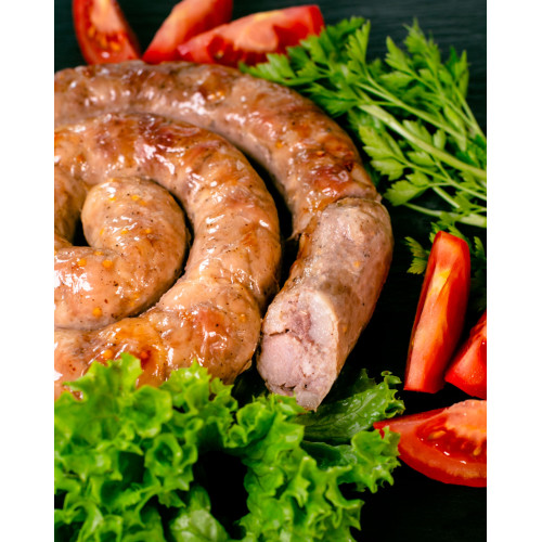 omemade Pork Sausage is a raw, oven-ready sausage made from stringless half-fat pork and pork fat in a natural casing. The meat is seasoned with fresh garlic, mustard seeds, salt and ground black pepper, giving the sausage a rich, homemade taste with a light spicy note and juicy texture when baked.