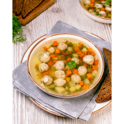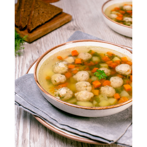 Meatball Soup is a ready-to-cook frozen soup mix for quick, home-style lunches and dinners. The blend includes potatoes, carrots, onion, herbs and minced pork with egg, salt and pepper, forming tender meatballs right in the pot and a rich, aromatic broth with vegetables.